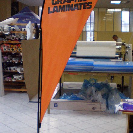 At Graphic Laminates all of our flag and banner products are manufactured from 100% polyester material. The graphics are digitally printed utilising the Dye Sublimation printing process, meaning the water based inks are printed onto a uniquely coated transfer paper and then released onto the fabric using a heat/pressure transfer process, which permanently transfers the dye to the fabric.